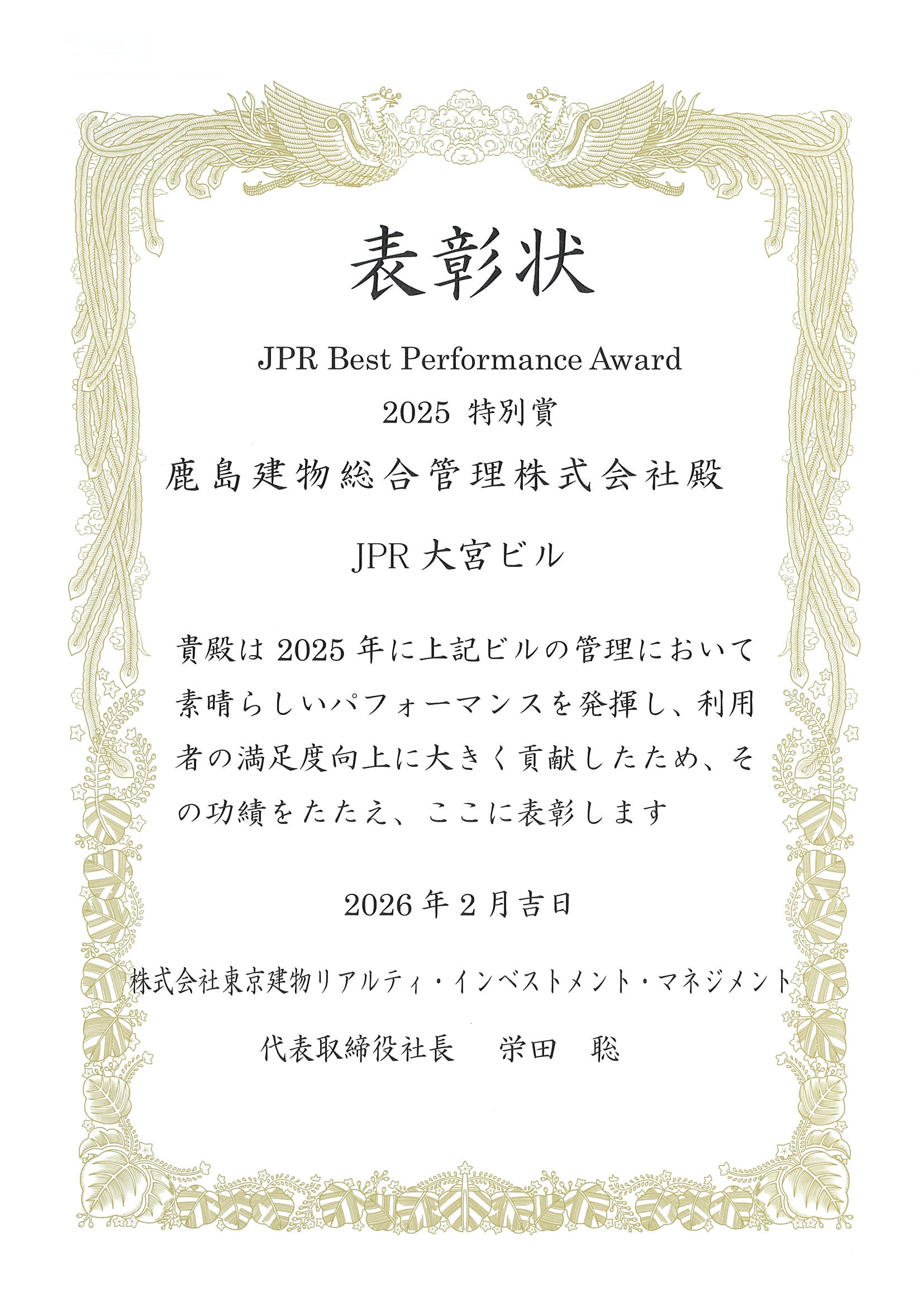 当社が管理をするJPR大宮ビルが「JPRベストパフォーマンスアワード2025 特別賞」を受賞しました。 この特別賞は日本プライムリアルティ投資法人(通称JPR)が、全国の保有ビルのなかから優れた対応・管理が行われている物件を選定・表彰するものです。